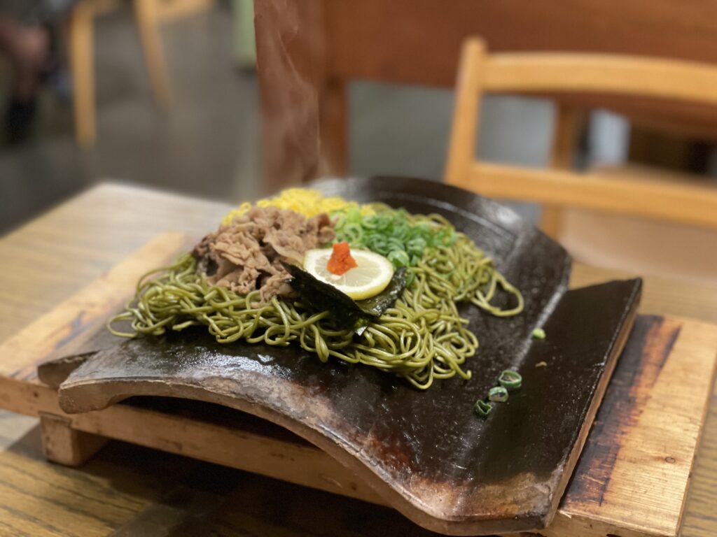 瓦そばは、熱した瓦の上に茶そばを乗せ、牛肉・錦糸卵・レモン・もみじおろしなどをトッピングした山口を代表するご当地グルメです。