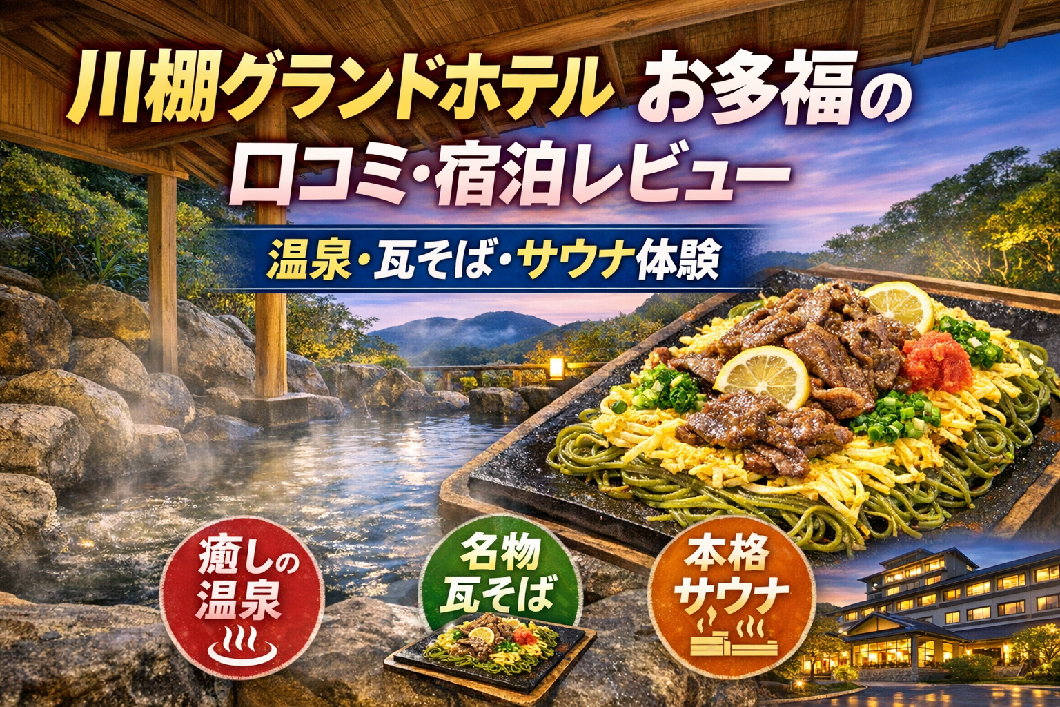 下関市豊浦町にある「川棚グランドホテルお多福」です。800年の歴史を持つ川棚温泉の老舗旅館であり、山口名物・瓦そばの本店「お多福」を館内に持つ、食と温泉の両方を楽しめるホテルです。